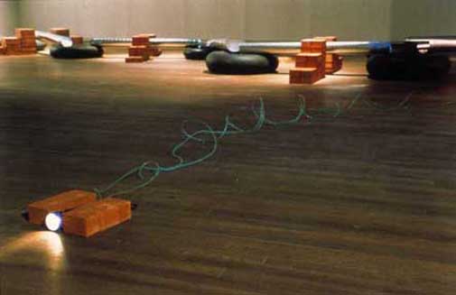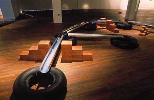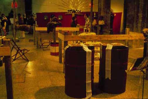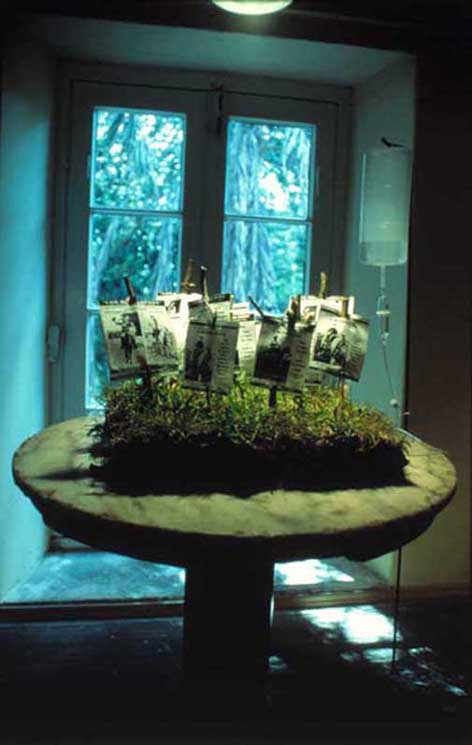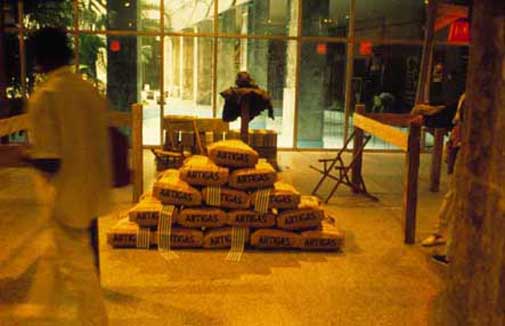 En realidad esa mirada arranca ya con Las sorpresitas, la instalación hecha en el año 94 para la Bienal de La Habana. Después también en Frutos del país (Subte Municipal, 1994), una instalación que está basada en una forma productiva del pasado, como son los carteles con lamparitas del carnaval. Si bien esos elementos son del pasado, en ciernes la propuesta apunta al futuro. Más que armar una memoria, como podía pasar con los mitos populares, presenta con elementos tradicionales nuestra situación actual. Ya en la muestra Made in Uruguay (Museo Blanes, con Luis Camnitzer, 1992) comenzaba a aparecer el tema del presente: aquellos pastizales sobre las mesas del Sorocabana, cada uno conteniendo elementos que podían ser considerados del pasado, pero el sistema de bolsas de suero que alimentaba o mantenía, como en un CTI, a esos elementos, te llevaba a un diagnóstico del presente. Era una situación ambigua, donde no sabías si eso iba a morir o a sobrevivir.